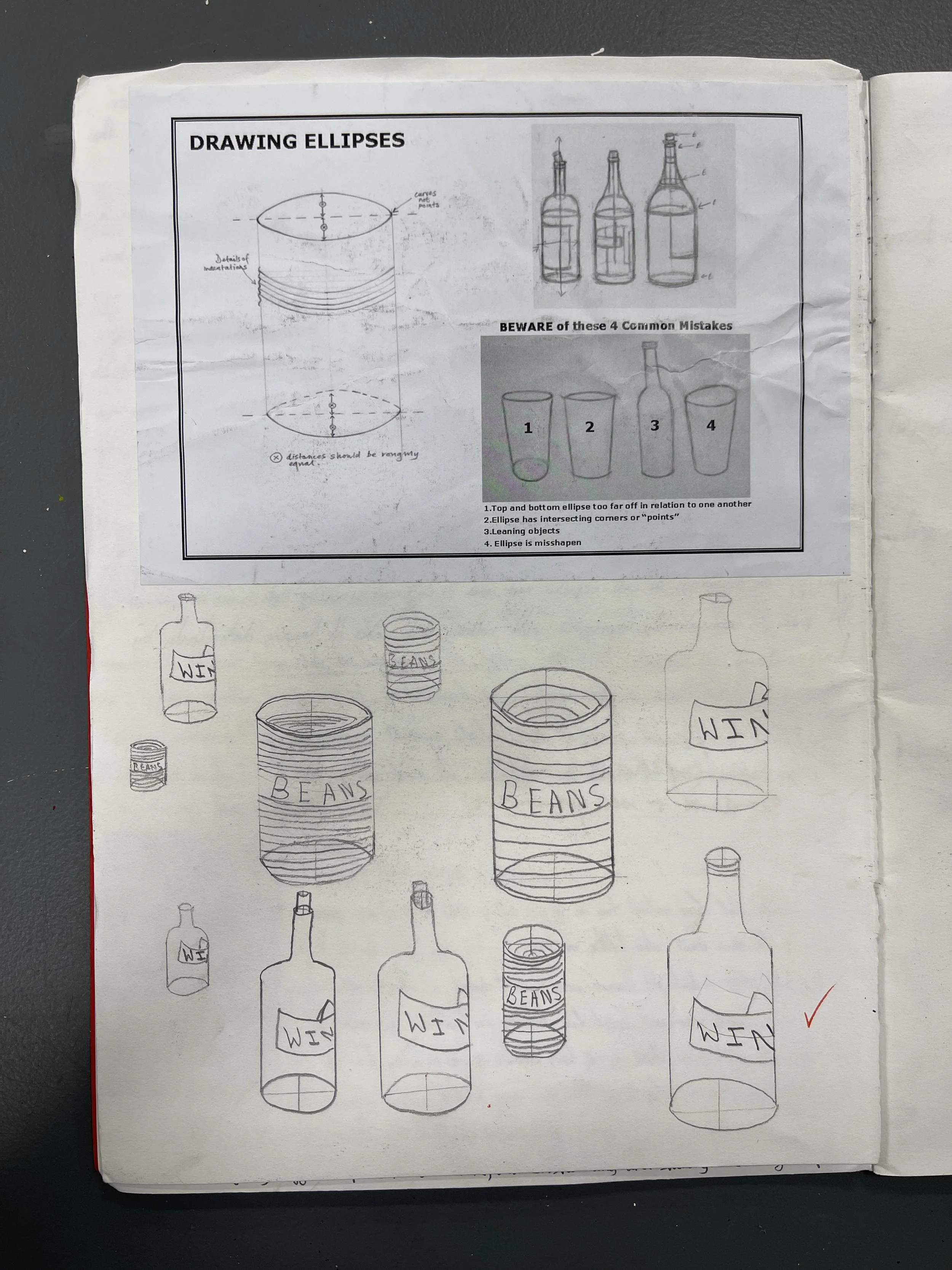 Classwork : Students watch the ‘Ellipse Drawing Demonstration’ video below. The video should be paused at the specified times. This will allow students to complete and check work. In this lesson students should aim to complete both tin can drawings (the bottle will be completed next lesson).