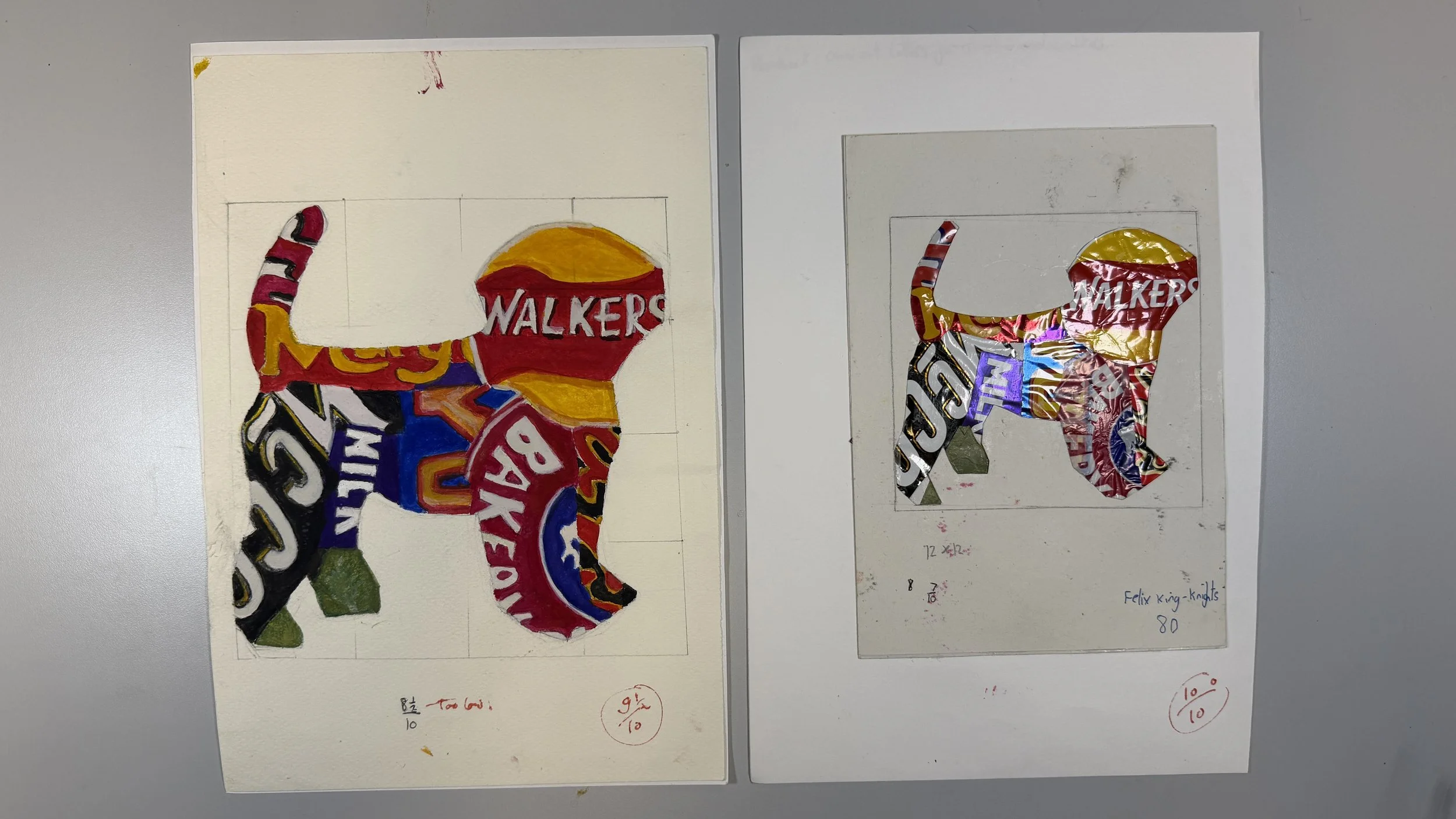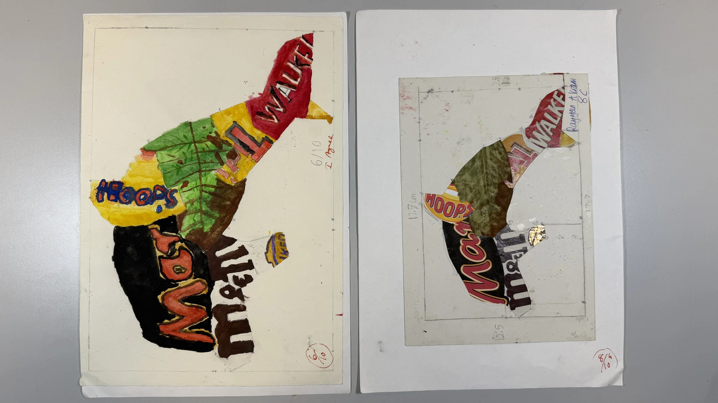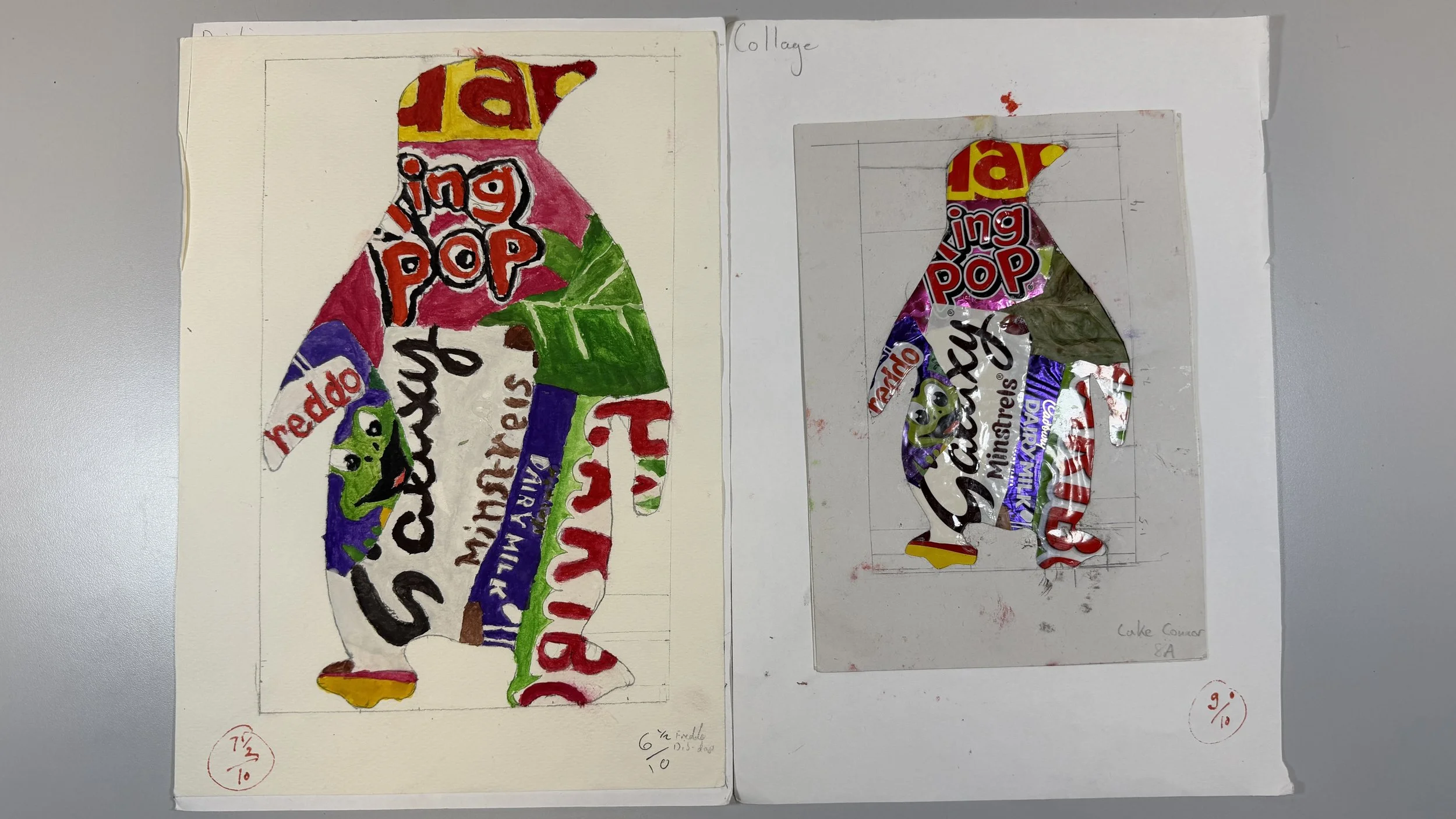 Later in the lesson it is expected that students will draw the outline of the wrappers, watching the the ‘Collage Drawing -Common Mistakes’ video below will help student work accurately when drawing the wrappers and lettering.