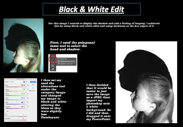 Classwork : Students now have two lessons to continue with the black and white editing work (and any colour editing extension work they choose to complete).